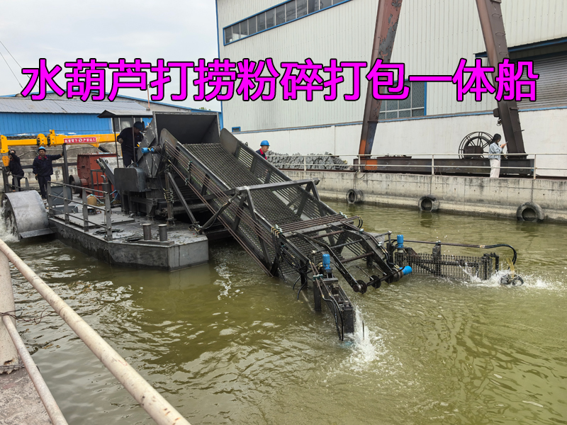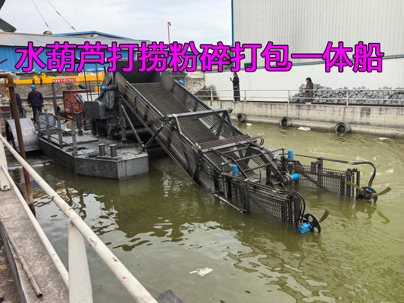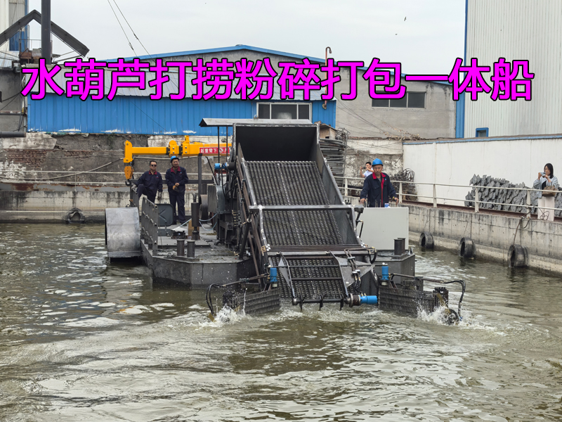 出口国外的水葫芦打捞+粉碎+打包一体船下水试机!